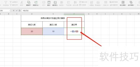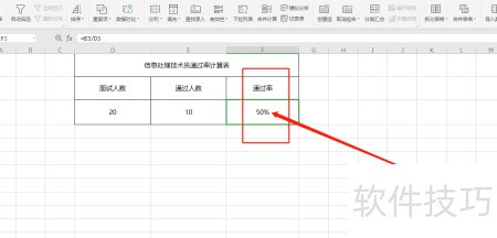 5、 第三,在通过率单元格中输入公式=E3/D3,以计算通过人数与面试人数的比率。