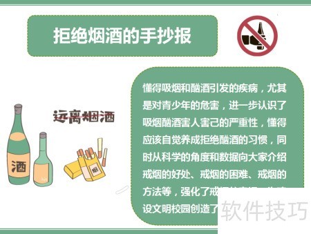 2、 绘制与拒绝烟酒主题相关的图案,添加装饰元素,使手抄报内容丰富、美观醒目。