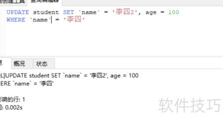 1、 更新指定表中满足条件的记录,将某一列的值修改为新值,语法结构为:表名、设置列值、条件限定。