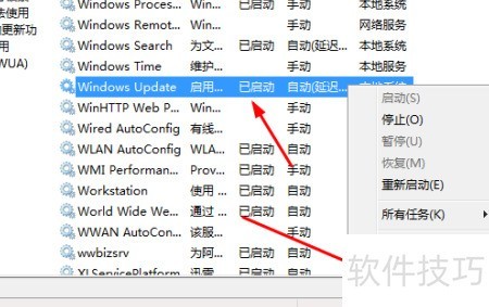 9、 找到Windows Update服务,右键点击并选择属性打开。