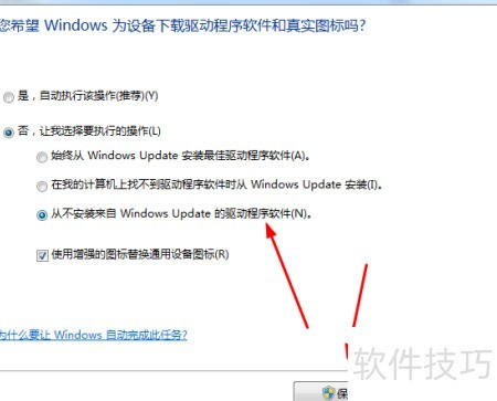 6、 选择不通过Windows更新安装驱动程序,然后点击保存设置。