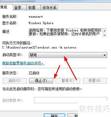 10、 将启动类型设为禁用,点击停止按钮,关闭Windows Update服务。
