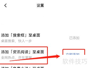 3、 进入设置页面,找到添加资讯阅读至桌面选项,点击立即添加即可,操作所示。