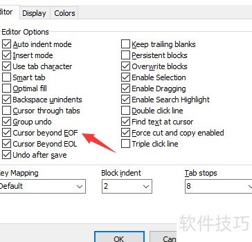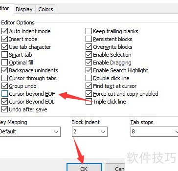 5、 取消勾选cursor Beyond eof后,点击确定即可。