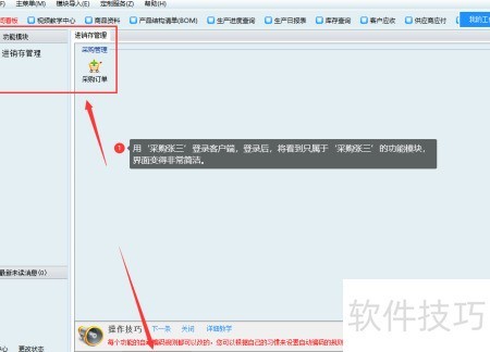 25、 以采购张三身份登录后,客户端仅显示专属功能,界面简洁清晰。