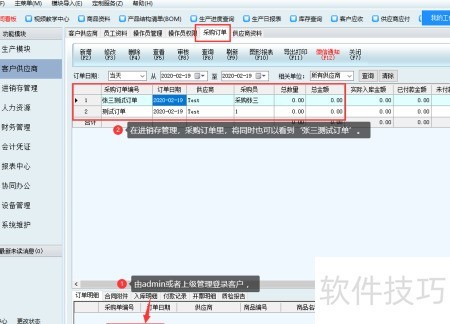 32、 管理员或上级登录后,在进销存系统的采购订单页面,可查看到张三测试订单信息。