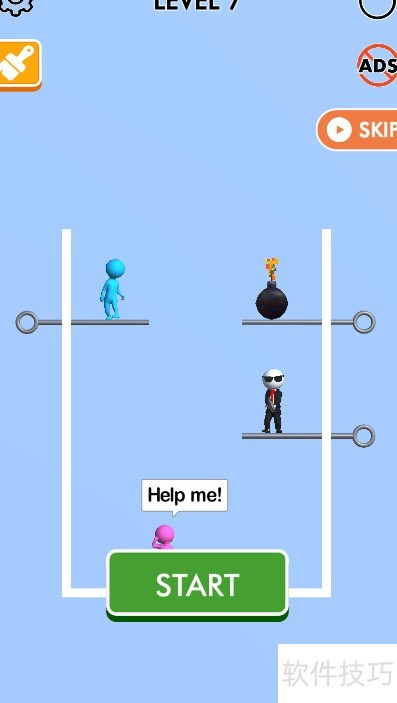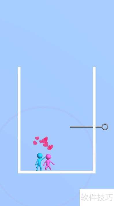 1、 关卡中有三根拉针,小粉人在底部求救,小蓝人位于左上方,具体情形见示意图。