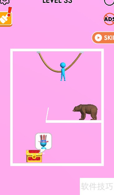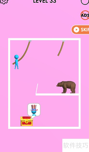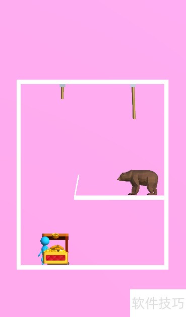 1、 本关目标是获取底部宝箱,小蓝人悬挂在上方,棕熊位于其右下方,具体布局见示意图。