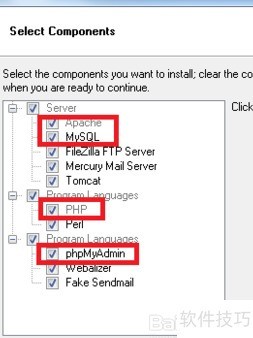 3、 程序安装完成后,选择所需组件时,Apache和PHP选项为灰色,表示这两项为必装组件,无法取消。
