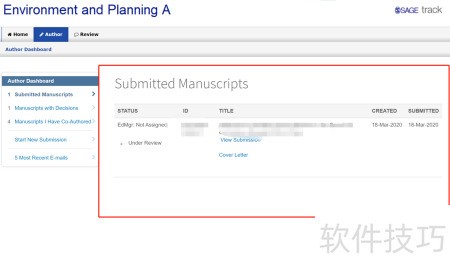 3、 在作者专栏中可查看已投稿件,包含编号、标题、日期及状态等信息。