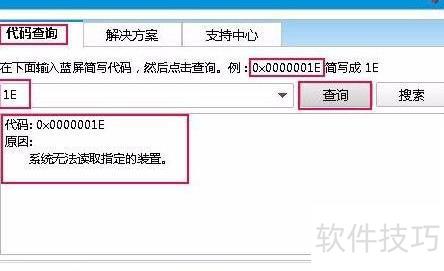5、 在搜索框输入故障代码后两位,例如1E,点击查询,下方窗口将显示导致蓝屏的具体原因。