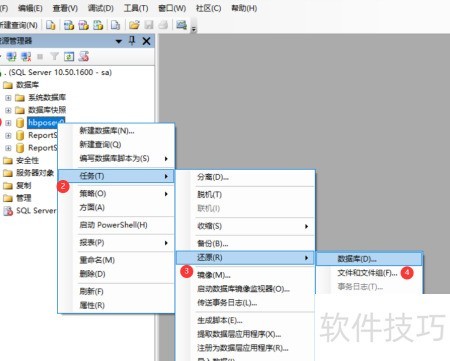2、 右键点击hbposev9数据库,依次选择任务、还原、数据库,开始还原操作。