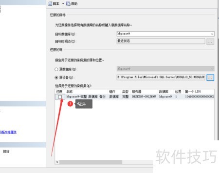 6、 在还原数据库 — hbposev9对话框中,选中选择用户还原的备份集区域里对应数据库的复选框。