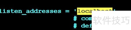 13、 修改postgresql.conf配置文件,取消号注释,将listen_addresses设置为*,以允许所有IP地址连接数据库服务。