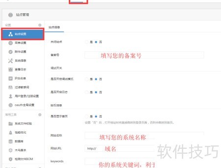 1、 配置站点名称、备案号及关键词等基本信息