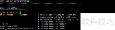 4、 修改 postgresql.conf 配置文件,将监听地址设为所有主机,以接收来自任意主机的连接请求。