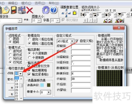 使用PCtoLCD2002完美版时,进入上方菜单栏,选择选项,在每行显示数据中可迅速调整点阵参数,操作简便,便于用户快速完成设置。