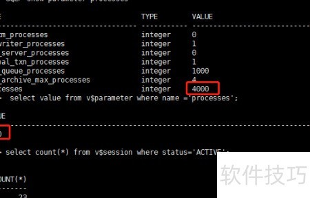 4、 第四步:查询数据库配置的最大连接数与最大会话数。可通过执行show parameter processes命令获取汇总信息,也可直接运行select value from v\$parameter where name = processes语句进行查看。当前数据库设置的最大进程连接数为4000,该数值代表系统允许同时处理的进程总数,是评估数据库并发能力的重要参数之一,需根据实际负载合理配置。