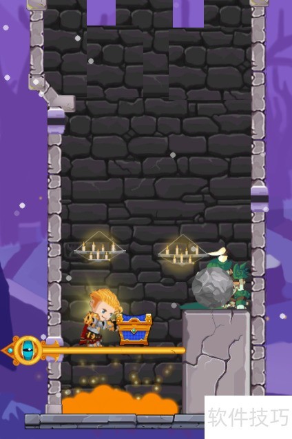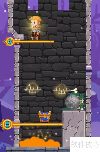 1、 本关含三个横向插销,宝箱位于熔岩上方,具体布局见示意图。