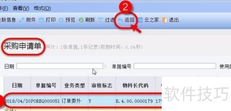 11、 查找待关联的采购申请单,选中相应记录行后,点击工具栏中的按钮完成操作。