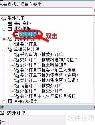 4、 在金蝶K/3 BOS界面右上角的项目窗口中,展开业务单据,找到委外订单并双击进入。
