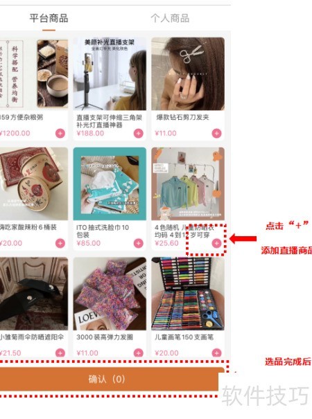 3、 第三步:4所示,点击添加宝贝,在平台商品列表中,通过+号选择需直播的商品,选定后点击确认,完成添加,5所示。