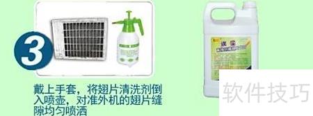 3、 自上而下、从左到右均匀喷洒涤尘液。若夏季气温持续高于35度,可先用清水轻微润湿铝翅片,再进行喷洒处理。