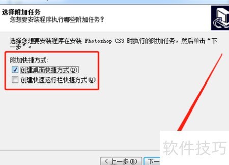 5、 进入附加选项界面,勾选创建桌面快捷方式,然后点击下一步。