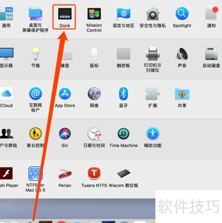 6、 进入系统偏好设置,选择DOCK栏选项。
