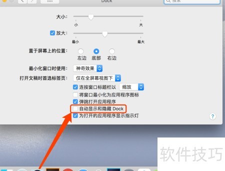3、 勾选下方自动隐藏或显示DOCK选项,启用后即可查看dock栏。