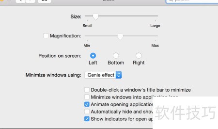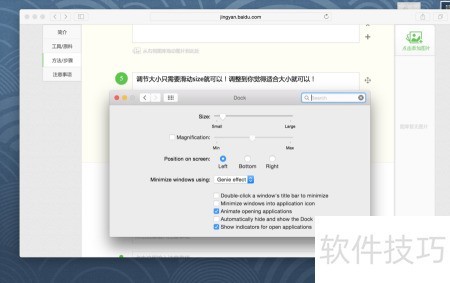 3、 所示,可调整dock的尺寸、位置、动画效果,并设置自动隐藏与显示等功能。