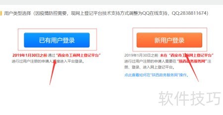 3、 若在2019年1月30日前未于西安市工商网上登记平台完成注册,需先前往陕西政务服务网进行账号注册并登录,随后进入网上登记系统,此时可直接点击第二个按钮继续操作。