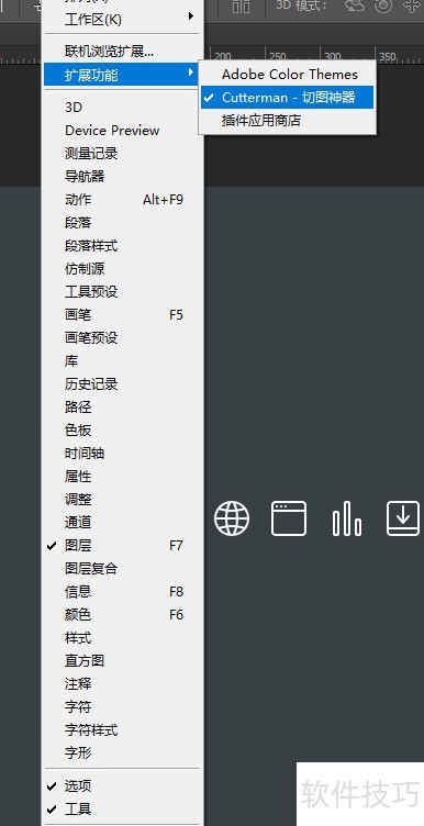 2、 在窗口菜单的扩展功能中查找已安装的插件。