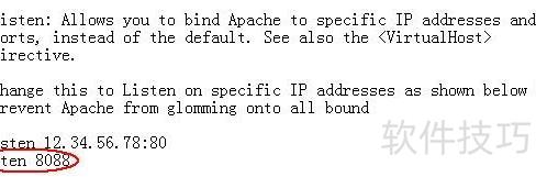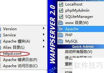 4、 左键点击系统托盘图标,在Apache菜单中直接打开httpd.conf文件,找到Listen 80项,将其修改为其他端口,例如我使用的8088。