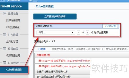8、 在数据分析软件中,进入数据配置的Cube更新设置,可进行全局更新配置。例如,可设定每周二凌晨0点自动执行Cube更新,具体操作所示。