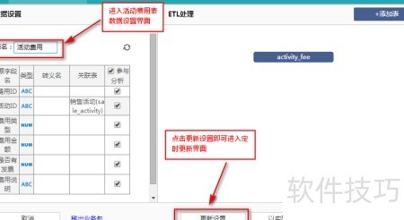 14、 进入数据分析软件,选择活动费用表,点击表设置界面中的更新设置按钮,操作所示。