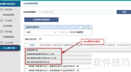 33、 在FineBI服务列表中点击Cube更新设置,可进入数据分析软件的Cube更新配置页面。在此界面可查看Cube更新日志,日志内容涵盖生成过程中出现的错误信息、数据库数据迁移耗时、索引创建时间以及字段关联生成所用时间,具体详情所示。