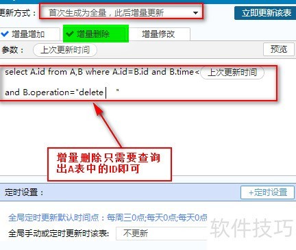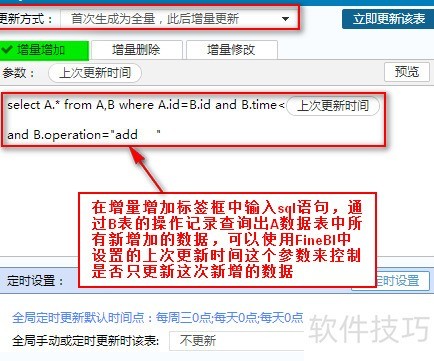 26、 数据分析软件中的增量更新,是指将数据库新增数据同步至数据立方体。通过执行SQL语句提取A表最新添加的记录,并结合FineBI的时间参数设置,控制仅更新本次新增部分,实现高效数据刷新,所示。