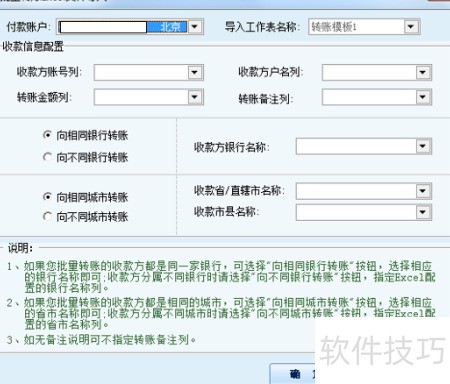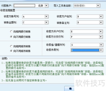 8、 导入表格后,系统将自动打开文件并弹出设置界面。若存在多个付款账号,需手动选择相应账户;工作表名称有多个时也需选定目标工作表。由于收款方涉及不同银行及城市,应勾选向不同银行转账和向不同城市转账选项。随后,在收款方账号到收款市县的范围内,选择A至H列进行数据匹配。