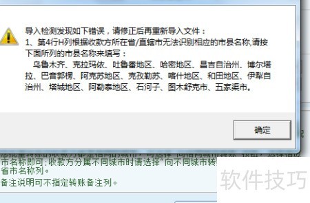 9、 点击确认后,若填写的银行或城市信息有误,系统将提示具体错误所在的行与列。请根据提示返回原表格修改并保存。银行名称错误可直接更正;若不清楚某地所属城市,可通过百度查询XX属于哪个市来确认。