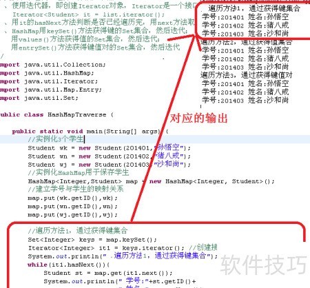 5、 通过entrySet()方法获取键值对的Set集合后进行迭代,图中已展示程序执行与输出结果的对应关系。与其他集合相比,映射类集合包含键与值两部分,既可通过键获取值,也可直接获取值或完整的键值对,因此在遍历方式上更加灵活多样,提供了更多选择。