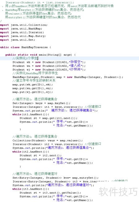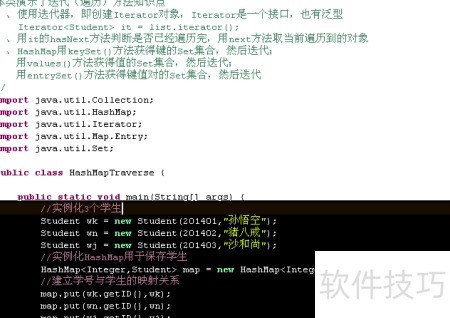 1、 1所示,首先创建了一个简单的Student类用于辅助编程;图2展示了主要代码部分,包含三位学生——孙悟空、猪八戒和沙和尚的实例化,以及一个HashMap集合map。接下来将简要分析代码中的数据存储结构及三种不同的遍历方式。
