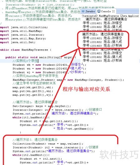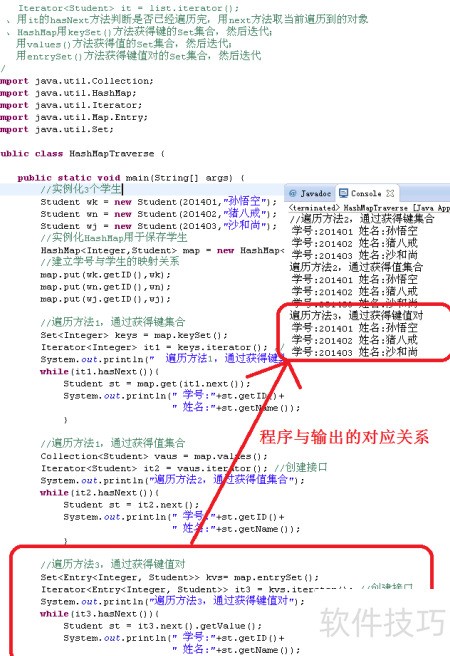 3、 通过HashMap的keySet()方法获取键的集合,遍历该集合,图示已清晰展示程序执行过程与输出结果的对应关系。