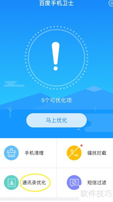 2、 百度手机卫士可自动扫描手机文件,进行优化、查杀病毒及清理垃圾。在界面中选择通讯录优化功能即可进一步管理联系人信息。