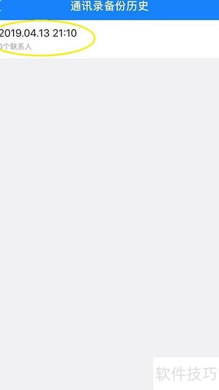 5、 在通讯录备份历史界面中,显示并点击备份时间选项。