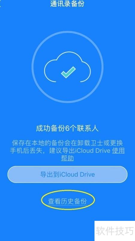 4、 备份界面显示成功保存6个联系人,随后点击查看历史备份选项。
