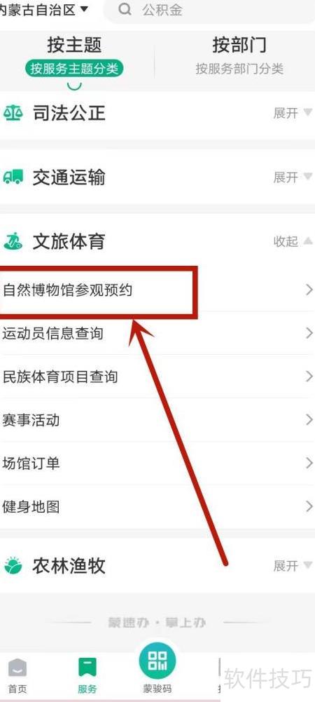 1、 打开手机蒙速办,进入文旅体育栏目,预约自然博物馆参观。
