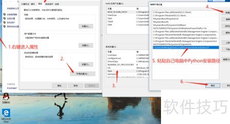 2、 进入此电脑,点击属性,选择高级系统设置,在高级选项卡中点击环境变量,找到系统变量中的Path并编辑,新增一项,将Python的安装路径复制粘贴进去即可完成配置。