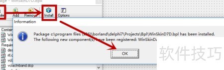 6、 使用相同方式打开.../VCLSKIN5.60/package/WinSkinD7D.dpk文件,系统会提示无法找到相关资源文件,点击确定后开始重建项目。随后点击编译按钮进行编译,完成后再点击安装选项。需要注意的是,此前步骤中可能未出现安装按钮,而此阶段应正常显示。若安装过程无误,程序将弹出成功提示窗口,显示新组件 WinSkinData.TSkinData 和 WinSkinStore.TSkinStore 已注册完成的信息。此时,可关闭安装包管理对话框,但务必在关闭前执行保存操作,确保所有更改被记录,避免后续重复配置或组件丢失。整个流程需按顺序操作,确保每一步顺利完成。