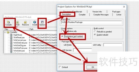 5、 在Package对话框中,点击Options按钮,进入Description选项卡下的Usage Options,勾选Design time and run time选项,确认后点击OK。随后点击Compile按钮,系统将自动完成编译操作。操作完成后,请务必保存所有更改,再关闭Package对话框,以确保设置生效且不丢失配置信息。整个过程需注意步骤顺序与保存动作。